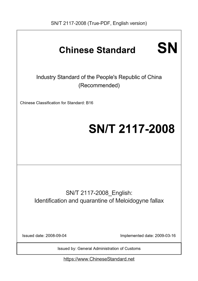 Delivery: <= 3 days. True-PDF full-copy in English will be manually translated and delivered via email. SN/T 2117-2008: Identification and quarantine of Meloidogyne fallax Status: Valid