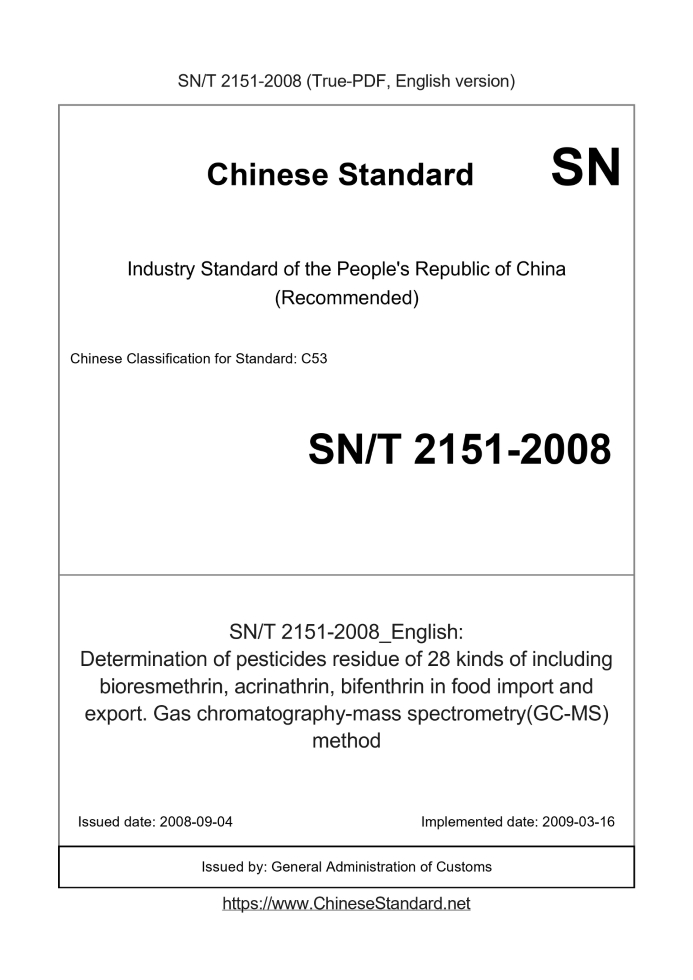 Delivery: <= 6 days. True-PDF full-copy in English will be manually translated and delivered via email. SN/T 2151-2008: Determination of pesticides residue of 28 kinds of including bioresmethrin, acrinathrin, bifenthrin in food import and export. Gas chromatography-mass spectrometry(GC-MS) method Status: Valid