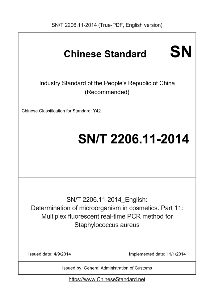 Delivery: <= 3 days. True-PDF full-copy in English will be manually translated and delivered via email. SN/T 2206.11-2014: Determination of microorganism in cosmetics. Part 11: Multiplex fluorescent real-time PCR method for Staphylococcus aureus Status: Valid
