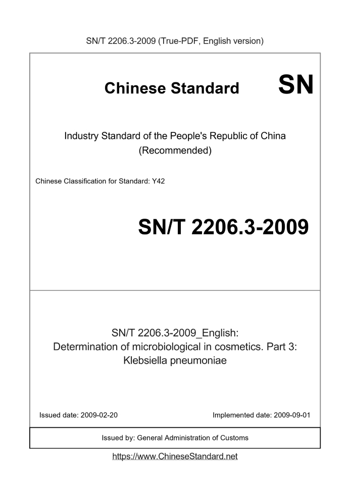 Delivery: <= 3 days. True-PDF full-copy in English will be manually translated and delivered via email. SN/T 2206.3-2009: Determination of microbiological in cosmetics. Part 3: Klebsiella pneumoniae Status: Valid