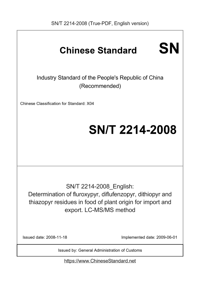 Basic dataStandard ID: SN/T 2214-2008 (SN/T2214-2008)Description (Translated English): Determination of fluroxypyr, diflufenzopyr, dithiopyr and thiazopyr residues in food of plant origin for import and export. LC-MS/MS method Sector / Industry: Commodity Inspection Standard (Recommended) Classification of Chinese Standard: X04 Word Count Estimation: 17,140 Date of Issue: 2008-11-18 Date of Implementation: 2009-06-01 Regulation (derived from): National Quality Inspection [2008] No. 577 Issuing agency(ies): General Administration of Customs Summary: This standard specifies the foods of plant origin fluroxypyr, dithiopyr pyridine, pyridine grass hydrazone fluoride pyridine four kinds of pyridine and thiophene grass herbicides liquid chromatography mass spectrometry/mass spectrometry. This standard applies to cabbage, corn and oranges fluroxypyr, dithiopyr pyridine, thiophene fluoropyrazole grass grass pyridine hydrazone and four kinds of pyridine herbicides quantitative determination and confirmation. SN/T 2214-2008: Determination of fluroxypyr, diflufenzopyr, dithiopyr and thiazopyr residues in food of plant origin for import and export. LC-MS/MS method---This is a DRAFT version for illustration, not a final translation. Full copy of true-PDF in English version (including equations, symbols, images, flow-chart, tables, and figures etc.) will be manually/carefully translated upon your order. Determination of fluroxypyr, diflufenzopyr, dithiopyr and thiazopyr residues in food of plant origin for import and export.LC-MS/MS method Exit inspection and quarantine industry standard book People's Republic of China Importers of plant origin foods fluroxypyr, dithiopyr pyridine, Determination diflufenzopyr pyridine and thiophene grass herbicide residues Liquid chromatography - mass spectrometry/mass spectrometry Posted 2008-11-18 2009-06-01 implementation People's Republic of China The State Administration of Quality Supervision, Inspection and Quarantine released ForewordThe Standard Appendix A and Appendix B are informative. This standard is proposed and managed by the National Certification and Accreditation Committee. This standard was drafted. People's Republic of China, Shenzhen CIQ. The main drafters of this standard. Jinbao Hui, Chen Bo, Xie Liqi, Huahong Hui, Zhang Jianying. This standard is the first release of the entry-exit inspection and quarantine industry standards. Importers of plant origin foods fluroxypyr, dithiopyr pyridine, Determination diflufenzopyr pyridine and thiophene grass herbicide residues Liquid chromatography - mass spectrometry/mass spectrometry1 ScopeThis standard specifies the botanical foods fluroxypyr, dithiopyr pyridine, thiophene diflufenzopyr and grass herbicides pyridine pyridine four kinds of liquid chromatography - Mass spectrometry/mass spectrometry. This standard applies to cabbage, corn and oranges fluroxypyr, dithiopyr piperidine, diflufenzopyr thiophene and pyridine four kinds of grass herbicides pyridine The quantitative determination and confirmation.2 Method summarySample residues fluroxypyr, dithiopyr piperidine, diflufenzopyr pyridine and thiophene grass extracted with acetonitrile, dried SupelcleanC18 SPE net Technology, using liquid chromatography - mass spectrometry/mass spectrometry and confirmed, external standard.3 reagent materialUnless otherwise indicated, the reagents used were of analytical grade, water is deionized water. 3.1 acetonitrile. chromatography. 3.2 Methanol. chromatographically pure. 3.3 formic acid. Chromatographic pure. 3.4 sodium chloride. 3.5 0.1% formic acid aqueous solution. Imbibe 1mL acid, transferred into a 1000mL volumetric flask with water to volume, and mix well. 3.6 0.1% formic acid - methanol (50 + 50, by volume). amount of 0.1% formic acid aqueous solution (3.5) 500mL to 1000mL volumetric flask with Methanol to volume, and mix well. 3.7 pyridine herbicides standards. fluroxypyr (C7H5C12FN2O3, CASN o. 69377-81-7), dithiopyr pyridine (C15H12F2N4O3, CASN o... 97886-45-8), thiophene grass pyridine (C16H17F5N2O2S, CASN o. 117718-60-2), greater than 99% purity. Diflufenzopyr (C15H16F5NO2S2, CASN o. 109293-97-2) as the standard liquid, at a concentration of 10mg/L, the solvent is acetonitrile. 3.8 standard stock solution. accurately weighed amount of fluroxypyr, dithiopyr pyridine, thiophene grass pyridine were dissolved in methanol and set the volume to brown volumetric flask Concentration equivalent to 500mg/L, a stock solution can be stored for 6 months at 0 ℃ ~ 4 ℃ in the dark. 3.9 mixed standard intermediate solution. accurately draw the right amount of fluroxypyr, dithiopyr pyridine, thiophene grass pyridine standard stock solution in a brown volumetric flask, and add Revenue and other pyridine herbicide concentration of diflufenzopyr with methanol to volume, the concentration of various herbicides as pyridine 1mg/L, this intermediate solution can be stored for one month at 0 ℃ ~ 4 ℃ in the dark. 3.10 mixed standard working solution. draw mixed standard amount of intermediate solution (3.9) according to need before use, with a blank sample matrix solution Liquid formulation. 3.11 SPE. SupelcleanC18,500mg/3mL, or equivalent person. 5mL acetonitrile and treated before use, holding cylinder Moist. 3.12 microporous membrane. 0.22μm, the organic phase type.4 instruments and equipment4.1 Liquid chromatography - mass spectrometry/mass spectrometer with ESI ion source. 4.2 Balance. a sense of volume and 0.0001g 0.01g. ......Tips & Frequently Asked Questions:Question 1: How long will the true-PDF of SN/T 2214-2008_English be delivered?Answer: Upon your order, we will start to translate SN/T 2214-2008_English as soon as possible, and keep you informed of the progress. The lead time is typically in 9 seconds (download/delivered in 9 seconds). The lengthier the document the longer the lead time.Question 2: Can I share the purchased PDF of SN/T 2214-2008_English with my colleagues?Answer: Yes. The purchased PDF of S