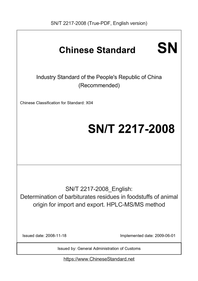 Delivery: <= 5 days. True-PDF full-copy in English will be manually translated and delivered via email. SN/T 2217-2008: Determination of barbiturates residues in foodstuffs of animal origin for import and export. HPLC-MS/MS method Status: Valid
