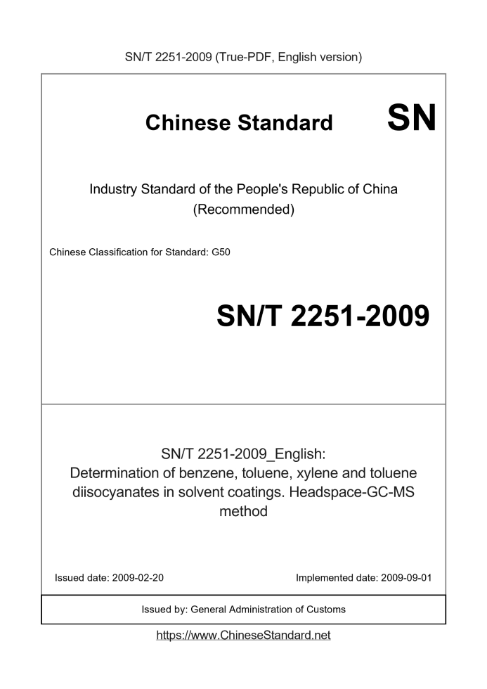 Delivery: <= 3 days. True-PDF full-copy in English will be manually translated and delivered via email. SN/T 2251-2009: Determination of benzene, toluene, xylene and toluene diisocyanates in solvent coatings. Headspace-GC-MS method Status: Valid