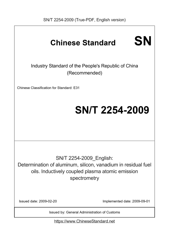 Basic dataStandard ID: SN/T 2254-2009 (SN/T2254-2009)Description (Translated English): Determination of aluminum, silicon, vanadium in residual fuel oils. Inductively coupled plasma atomic emission spectrometry Sector / Industry: Commodity Inspection Standard (Recommended) Classification of Chinese Standard: E31 Classification of International Standard: 75.080 Word Count Estimation: 7,759 Date of Issue: 2009-02-20 Date of Implementation: 2009-09-01 Quoted Standard: GB/T 6682 Regulation (derived from): 2009 No. 5 (total 113) Chinese industry standard filing Announcements Issuing agency(ies): General Administration of Customs Summary: This standard specifies the inductively coupled plasma atomic emission spectrometry residual fuel oil in aluminum, silicon, vanadium content approach. This standard applies to residual fuel oil in aluminum, silicon, vanadium content, detection limit is as follows: Al: 0. 1mg/kg, silicon: 0. 2mg/kg, Vanadium: 0. 1mg/kg. SN/T 2254-2009: Determination of aluminum, silicon, vanadium in residual fuel oils. Inductively coupled plasma atomic emission spectrometry---This is a DRAFT version for illustration, not a final translation. Full copy of true-PDF in English version (including equations, symbols, images, flow-chart, tables, and figures etc.) will be manually/carefully translated upon your order. Determination of aluminum, silicon, vanadium in residual fuel oils.Inductively coupled plasma atomic emission spectrometry Exit inspection and quarantine industry standard book People's Republic of China Determination of residual fuel oil in aluminum, silicon, vanadium Inductively coupled plasma atomic emission spectrometry Posted 2009-02-20 2009-09-01 implementation People's Republic of China The State Administration of Quality Supervision, Inspection and Quarantine released ForewordAppendix A of this standard is an informative annex. This standard is proposed and managed by the National Certification and Accreditation Administration Committee. This standard was drafted. People's Republic of China Guangdong CIQ. The main drafters. Zhang Haifeng, Liangmiao Ling, Zhong Zhiguang, Xiaoda Hui, Tan Zhiyi, Di Cuiping, Zheng Jianguo. This standard is the first release of the entry-exit inspection and quarantine industry standards. Determination of residual fuel oil in aluminum, silicon, vanadium Inductively coupled plasma atomic emission spectrometry1 ScopeThis standard specifies the inductively coupled plasma atomic method for the determination of aluminum, silicon, vanadium content of residual fuel oil emission spectrometry. This standard applies to aluminum, silicon, vanadium content determination of residual fuel oil, the detection limit is as follows. Al. 0.1mg/kg; Si. 0.2mg/kg; V. 0.1mg/kg.2 Normative referencesThe following documents contain provisions which, through reference in this standard and become the standard terms. For dated references, subsequent Amendments (not including errata content) or revisions do not apply to this standard, however, encourage the parties to the agreement are based on research Whether the latest versions of these documents. For undated reference documents, the latest versions apply to this standard. Laboratory use specifications and test methods GB/T 6682 Analysis3 Method summaryThe samples were microwave ashing, adding flux and burning in a muffle furnace. After cooling, tartaric acid - hydrochloric acid solution to dissolve the melt, Test solution by inductively coupled plasma atomic emission spectrometer.4 ReagentsUnless otherwise indicated, using analytical grade reagents and confirm compliance with GB/T 6682 in the secondary water requirements in the analysis only. 4.1 dilithium tetraborate. 4.2 lithium fluoride. 4.3 tartaric acid. 4.4 Flux. 90% (mass fraction) dilithium tetraborate and 10% (by mass) of a mixture of lithium fluoride. 4.5 nitric acid (ρ = 1.42g/mL). 4.6 hydrochloric acid (ρ = 1.19g/mL). 4.7 tartaric acid - hydrochloric acid solution. 5g tartaric acid dissolved in 40mL of concentrated hydrochloric acid, water volume to 1000mL. 4.8 stock standard solution (available from National Standards Centre). 4.8.1 Aluminum stock standard solution (1000μg/mL). 4.8.2 Vanadium standard solution (1000μg/mL). 4.8.3 Silicon standard stock solution (500μg/mL).5 Equipment5.1 Inductively coupled plasma atomic emission spectrometer. 5.2 Microwave ashing furnace. temperature program can be carried out using a temperature range of room temperature ~ 1200 ℃, temperature sensing the amount of ± 1 ℃. 5.3 muffle furnace. and can be heated to a constant at 925 ℃ ± 25 ℃. 5.4 Platinum crucible. Capacity 30mL ~ 50mL. Step 6 Analysis 6.1 Sample Preparation Heating fluid into the specimen, shake, take 100mL beaker, slightly cooled liquid to remain under state for weighing. ......Tips & Frequently Asked Questions:Question 1: How long will the true-PDF of SN/T 2254-2009_English be delivered?Answer: Upon your order, we will start to translate SN/T 2254-2009_English as soon as possible, and keep you informed of the progress. The lead time is typically in 9 seconds (download/delivered in 9 seconds). The lengthier the document the longer the lead time.Question 2: Can I share the purchased PDF of SN/T 2254-2009_English with my colleagues?Answer: Yes. The purchased PDF of SN/T 2254-2009_English will be deemed to be sold to your employer/organization who actually pays for it, including your colleagues and your employer's intranet.Question 3: Does the price include tax/VAT?Answer: Yes. Our tax invoice, downloaded/delivered in 9 seconds, includes all tax/VAT and complies with 100+ countries' tax regulations (tax exempted in 100+ countries) -- See Avoidance of Double Taxation Agreements (DTAs): List of DTAs signed between Singapore and 100+ countriesQuestion 4: Do you accept my currency other than USD?Answer: Yes. If you need your currency to be printed on the invoice, please write an email to Sales@ChineseStandard.net. In 2 working-hours, we will