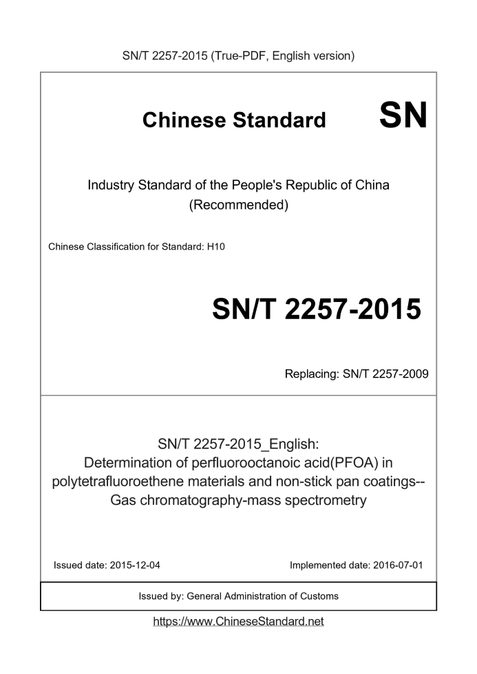 SN/T 2257-2015229 Add to Cart 3 days Determination of perfluorooctanoic acid(PFOA) in polytetrafluoroethene materials and non-stick pan coatings--Gas chromatography-mass spectrometry Valid
