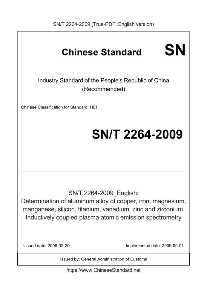Basic dataStandard ID: SN/T 2264-2009 (SN/T2264-2009)Description (Translated English): Determination of aluminum alloy of copper, iron, magnesium, manganese, silicon, titanium, vanadium, zinc and zirconium. Inductively coupled plasma atomic emission spectrometry Sector / Industry: Commodity Inspection Standard (Recommended) Classification of Chinese Standard: H61 Classification of International Standard: 77.040 Word Count Estimation: 8,824 Date of Issue: 2009-02-20 Date of Implementation: 2009-09-01 Quoted Standard: GB/T 602; GB/T 6682 Regulation (derived from): Chinese industry standard filing Notice 2009 No. 5 (No. 113 overall) Issuing agency(ies): General Administration of Customs Summary: This standard specifies the alloy of copper, iron, magnesium, manganese, silicon, titanium, vanadium, zinc and zirconium nine elements by inductively coupled plasma atomic emission spectroscopy method. This standard applies to the aluminum alloy of copper, iron, magnesium, manganese, silicon, titanium, vanadium, zinc and zirconium Determination of nine elements, measurement ranges are shown in Table 1. SN/T 2264-2009: Determination of aluminum alloy of copper, iron, magnesium, manganese, silicon, titanium, vanadium, zinc and zirconium. Inductively coupled plasma atomic emission spectrometry---This is a DRAFT version for illustration, not a final translation. Full copy of true-PDF in English version (including equations, symbols, images, flow-chart, tables, and figures etc.) will be manually/carefully translated upon your order. Determination of aluminum alloy of copper, iron, magnesium, manganese, silicon, titanium, vanadium, zinc and zirconium.Inductively coupled plasma atomic emission spectrometry Exit inspection and quarantine industry standard book People's Republic of China Aluminum alloy of copper, iron, magnesium, manganese, silicon, Determination of titanium, vanadium, zinc and zirconium Inductively coupled plasma atomic emission spectrometry Posted 2009-02-20 2009-09-01 implementation People's Republic of China The State Administration of Quality Supervision, Inspection and Quarantine released ForewordAppendix B of this standard is a normative appendix, Appendix A is an information appendix. This standard is proposed and managed by the National Certification and Accreditation Administration Committee. This standard was drafted. People's Republic of China Shanghai Entry-Exit Inspection and Quarantine Bureau. The main drafters of this standard. Gong Siwei, Chu people's livelihood, Xucheng Min. This standard is the first release of the entry-exit inspection and quarantine industry standards. Aluminum alloy of copper, iron, magnesium, manganese, silicon, Determination of titanium, vanadium, zinc and zirconium Inductively coupled plasma atomic emission spectrometry1 ScopeThis standard specifies the inductively coupled plasma atomic aluminum alloy of copper, iron, magnesium, manganese, silicon, titanium, vanadium, zinc and zirconium 9 elements emit light Determination of spectrum. This standard applies to aluminum alloys Determination of copper, iron, magnesium, manganese, silicon, titanium, vanadium, zinc and zirconium 9 elements, measuring range in Table 1. Measurement range Table 19 Elements% Element measurement range measurement range of elements Cu 0.10 ~ 10.00 Ti 0.001 ~ 0.500 Fe 0.10 ~ 2.00 V 0.001 ~ 0.500 Mg 0.10 ~ 10.00 Zn 0.10 ~ 10.00 Mn 0.10 ~ 2.00 Zr 0.001 ~ 0.500 Si 0.10 ~ 20.002 Normative referencesThe following documents contain provisions which, through reference in this standard and become the standard terms. For dated references, subsequent Amendments (not including errata content) or revisions do not apply to this standard, however, encourage the parties to the agreement are based on research Whether the latest versions of these documents. For undated reference documents, the latest versions apply to this standard. Preparation of standard solution of GB/T 602 Determination of impurities in chemical reagents Laboratory use specifications and test methods GB/T 6682 Analysis3 Method summarySample was dissolved with sodium hydroxide solution, adding acidified with nitric acid, dilute to volume, the sample solution was introduced into the plasma flame, and as excited A light source, the corresponding element in the spectrometer at the wavelength of the spectral intensity measured.4 ReagentsThe standard reagents were used gifted class pure reagents, test water to comply with GB/T 6682 specified secondary water. 4.1 high purity aluminum (aluminum content ≥99.999%). Nitrate 4.2 (ρ1.42g/mL). 4.3 nitric acid (1 + 1). 4.4 Sodium hydroxide solution (100g/L). 4.5 Sodium hydroxide solution (50g/L). 4.6 Hydrogen peroxide (97 + 3, Vp/Vp). 4.7 aluminum matrix solution. Weigh 0.9000g high purity (4.1) and placed in 200mL teflon beaker, add 50mL of sodium hydroxide Solution (4.4), covered with teflon cap, slowly heat the reaction carried out until the complete dissolution of aluminum, and concentrated to a viscous, fluid can not dry out Body cooling, 50mL of nitric acid (4.2), a little shake, and heating was continued until the solution is clear and slightly boiled, cooled water to wash with a small amount of poly ...... |