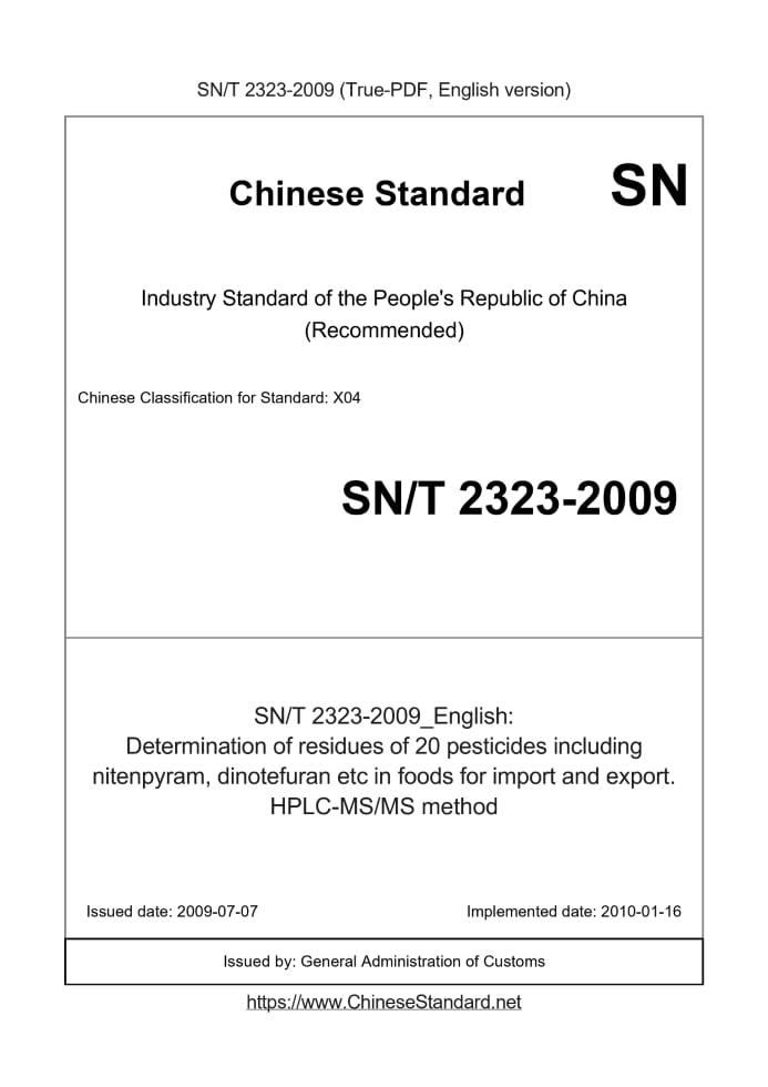 Basic dataStandard ID: SN/T 2323-2009 (SN/T2323-2009)Description (Translated English): Determination of residues of 20 pesticides including nitenpyram, dinotefuran etc in foods for import and export. HPLC-MS/MS method Sector / Industry: Commodity Inspection Standard (Recommended) Classification of Chinese Standard: X04 Word Count Estimation: 37,370 Date of Issue: 2009-07-07 Date of Implementation: 2010-01-16 Regulation (derived from): Industry standard filing Notice 2009 No. 10 (No. 118 overall) Issuing agency(ies): General Administration of Customs Summary: This standard specifies the food adjoin insects amines, amine Gap insects, snails mellea amines, SBR you Lynn, kill dragonfly Long A Mi, thirteen you Lynn, leaf fungus wow, kill dragonfly Long veins, dense destroy Ting, tiamulin, spinosad A, spinosyn D, Abamectin, emamectin 1, emamectin 2, two grasping acrylamide, Yu insects phosphorus, allyl Oh drunk, abamectin, avermectin methyl ammonium formate pesticide residues in liquid chromatography mass spectrometry/mass spectrometry and sample preparation. This standard applies to out of the stone rice, brown rice, corn, barley and wheat more than 20 kinds of pesticide residues in the detection and confirmation. SN/T 2323-2009: Determination of residues of 20 pesticides including nitenpyram, dinotefuran etc in foods for import and export. HPLC-MS/MS method---This is a DRAFT version for illustration, not a final translation. Full copy of true-PDF in English version (including equations, symbols, images, flow-chart, tables, and figures etc.) will be manually/carefully translated upon your order. Determination of residues of 20 pesticides including nitenpyram, dinotefuran etc in foods for import and export.HPLC-MS/MS method Exit inspection and quarantine industry standard book People's Republic of China Imported and exported food Pi insects amines, Dinotefuran and other 20 kinds of pesticide residues detection method Liquid chromatography - mass spectrometry/mass spectrometry Posted 2009-07-07 2010-01-16 implementation People's Republic of China The State Administration of Quality Supervision, Inspection and Quarantine released ForewordThe Standard Appendix A, Appendix B are informative appendices. This standard is proposed and managed by the National Certification and Accreditation Administration Committee. This standard is the responsibility of the People's Republic of China, Liaoning and Beijing Entry-Exit Inspection and Quarantine People's Republic of China Drafted. The main drafters of this standard. Dongzhen Lin, Xiao Shanshan, Lin Weixuan, with Kai Tian Miao, Li Yichen, right Xing, Xu Chao, a. This standard is the first release of the entry-exit inspection and quarantine industry standards. Imported and exported food Pi insects amines, Dinotefuran and other 20 kinds of pesticide residues detection method Liquid chromatography - mass spectrometry/mass spectrometry1 ScopeThis standard specifies the foods Pi clothianidin, dinotefuran, spiroxamine, fenpropimorph, acaricidal Long - formamidine, tridemorph, metconazole, acaricidal Long - urea, close off statins, tiamulin, spinosyn A, spinosyn D, emamectin, emamectin 1, emamectin 2, dichloropropene amines, phosphorus insecticide diniconazole, avermectin, methyl formamide avermectin pesticide residues in liquid chromatography - mass spectrometry/mass spectrometry party Method and sample preparation methods. This standard applies to the import and export of rice, brown rice, corn, barley and wheat more than 20 kinds of pesticide residues in the detection and confirmation.2 Method summaryAcetonitrile in water sample was extracted with n-hexane liquid-liquid partition first, and then the secondary amine N- graphite and carbon SPE column (PSA) net Technology, using liquid chromatography - mass spectrometry/mass spectrometry detection and confirmation, external standard.3 Reagents and materialsUnless otherwise specified, the reagents were HPLC grade water re-distilled water. 3.1 n-hexane. 3.2 toluene. 3.3 methanol. 3.4 acetonitrile. 3.5 formic acid. 3.6 Sodium chloride. AR. 3.7 Magnesium sulfate heptahydrate. AR. 3.8 acetonitrile - toluene solution. acetonitrile and toluene (3 + 1, volume ratio). 3.9 The pesticide standards. Pi worm amine (Nitenpyram, CAS number. 150824-47-8), dinotefuran (Dinotefuran, CAS Number. 165252- 70-0), spiroxamine (Spiroxamine, CAS number. 118134-30-8), fenpropimorph (Fenpropimorph, CAS number. 67564-91-4), Diafenthiuron - carboxamidine (Diafenthiuron-methanimidamide, CAS number. 136337-81-9), tridemorph (Tridemorph, CAS number. 81412-43-3), metconazole (Metconazole, CAS number. 125116-23-6) Diafenthiuron - urea (Diafenthiuron-urea, CAS number. 136337-67-2), spinosyn A (SpinosynA, CAS number. 131929-60-7), spinosyn D (SpinosynD, CAS number. 131929-63-0), Dichlormid (Dichlormid, CAS number. 37764-25-3), deworming phosphorus (Naphthalophos, CAS Number. 1491- 41-4), diniconazole (Diniconazole, CAS number. 83657-24-3) purity greater than or equal to 97%; close off Ting (Milbemectin, CAS number. 51596-10-2), Tiamulin (Tiamulin-fumarate, CAS number. 55297-96-6), emamectin (Emamectin-amino), Emamectin 1 (Emamectin-methylamino1), emamectin 2 (Emamectin-methy1amino2), Avi Streptozotocin (Abamectin, CAS number. 71751-41-2), methyl formate amine avermectin (Emamectin-N-methylformylamino) pure Greater than or equal to 80% of the average. 3.10 standard stock solution. namely, accurately weighed amount of pesticide standards (3.9) with acetone dubbed the concentration of standard stock 100μg/mL of Preparation of liquid. Standard stock solution at 0 ℃ ~ 4 ℃ storage conditions, preparation once every 12 months. ......Tips & Frequently Asked Questions:Question 1: How long will the true-PDF of SN/T 2323-2009_English be delivered?Answer: Upon your order, we will start to translate SN/T 2323-2009_English as soon as possible, and keep you informed of the progress. The lead time is typically in 9 seconds (download/delivered in 9 seconds). 