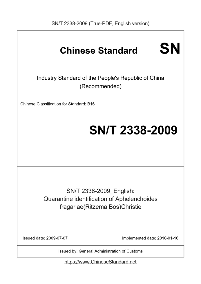 Delivery: <= 3 days. True-PDF full-copy in English will be manually translated and delivered via email. SN/T 2338-2009: Quarantine identification of Aphelenchoides fragariae(Ritzema Bos)Christie Status: Valid