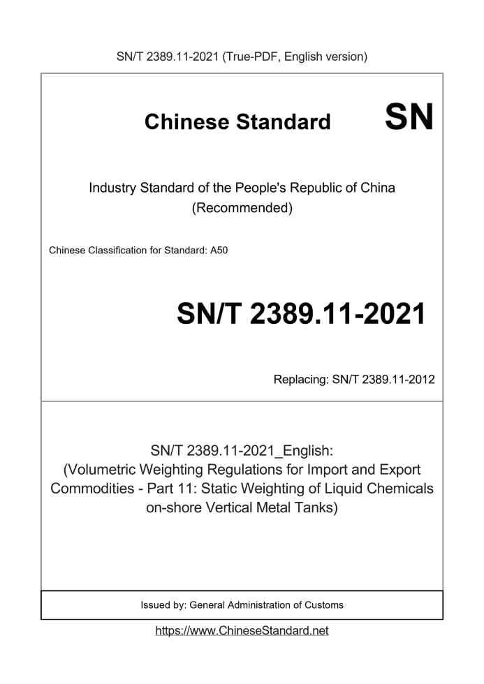 Delivery: <= 5 days. True-PDF full-copy in English will be manually translated and delivered via email. SN/T 2389.11-2021: (Volumetric Weighting Regulations for Import and Export Commodities - Part 11: Static Weighting of Liquid Chemicals on-shore Vertical Metal Tanks) Status: Valid SN/T 2389.11: Historical versions