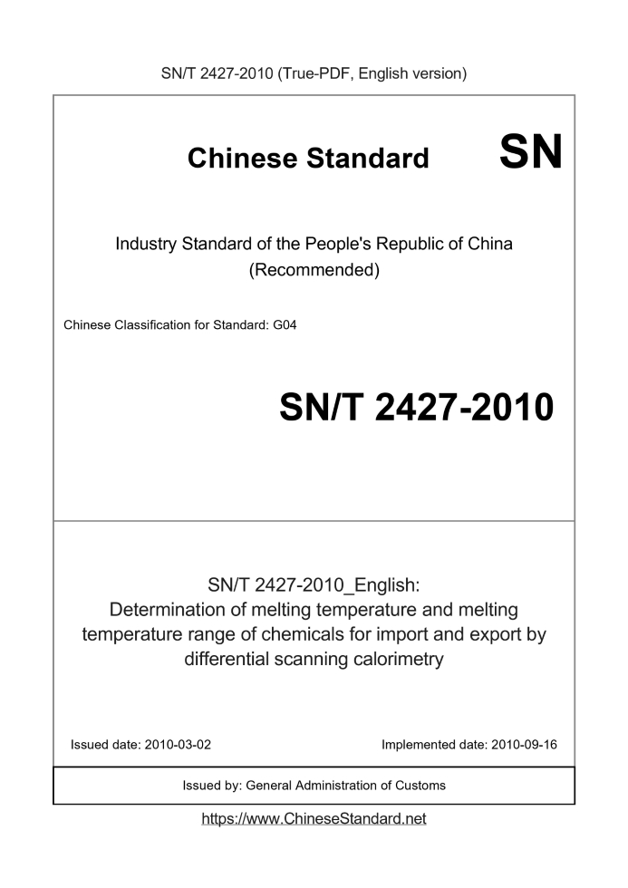 Delivery: <= 3 days. True-PDF full-copy in English will be manually translated and delivered via email. SN/T 2427-2010: Determination of melting temperature and melting temperature range of chemicals for import and export by differential scanning calorimetry Status: Valid