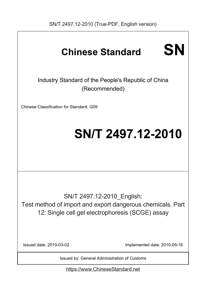 Delivery: <= 3 days. True-PDF full-copy in English will be manually translated and delivered via email. SN/T 2497.12-2010: Test method of import and export dangerous chemicals. Part 12: Single cell gel electrophoresis (SCGE) assay Status: Valid