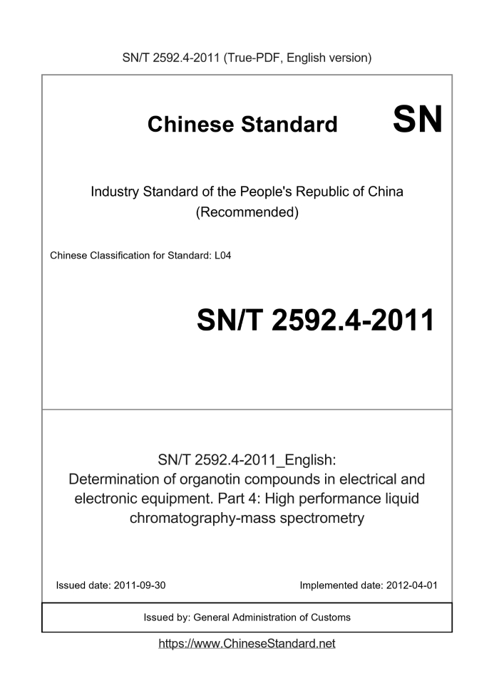 Delivery: <= 3 days. True-PDF full-copy in English will be manually translated and delivered via email. SN/T 2592.4-2011: Determination of organotin compounds in electrical and electronic equipment. Part 4: High performance liquid chromatography-mass spectrometry Status: Valid