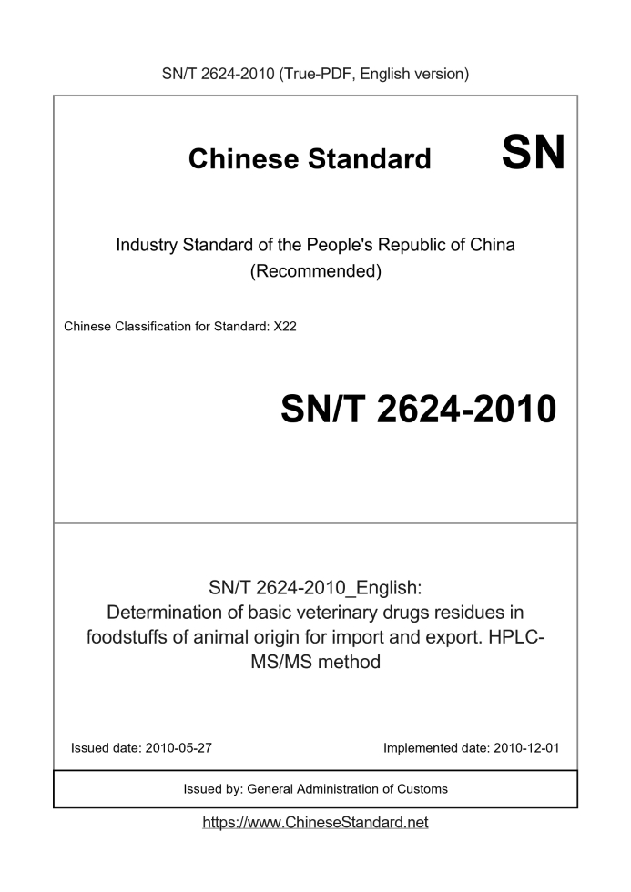 Delivery: <= 8 days. True-PDF full-copy in English will be manually translated and delivered via email. SN/T 2624-2010: Determination of basic veterinary drugs residues in foodstuffs of animal origin for import and export. HPLC-MS/MS method Status: Valid