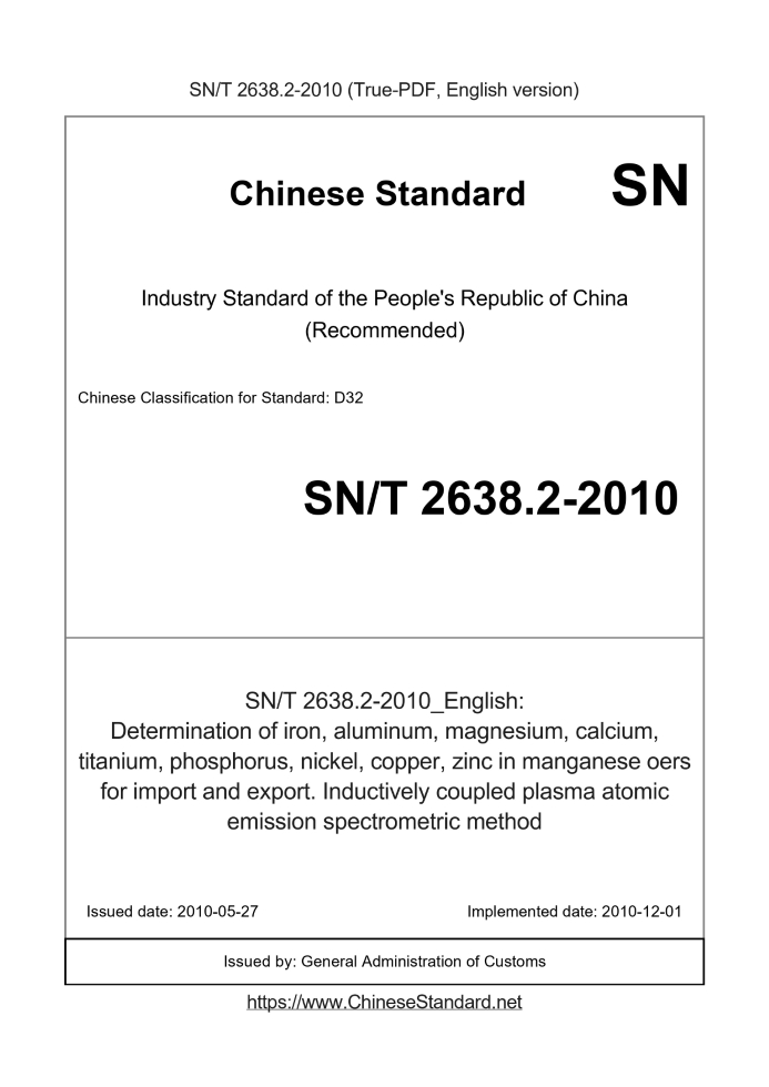 Delivery: <= 3 days. True-PDF full-copy in English will be manually translated and delivered via email. SN/T 2638.2-2010: Determination of iron, aluminum, magnesium, calcium, titanium, phosphorus, nickel, copper, zinc in manganese oers for import and export. Inductively coupled plasma atomic emission spectrometric method Status: Valid