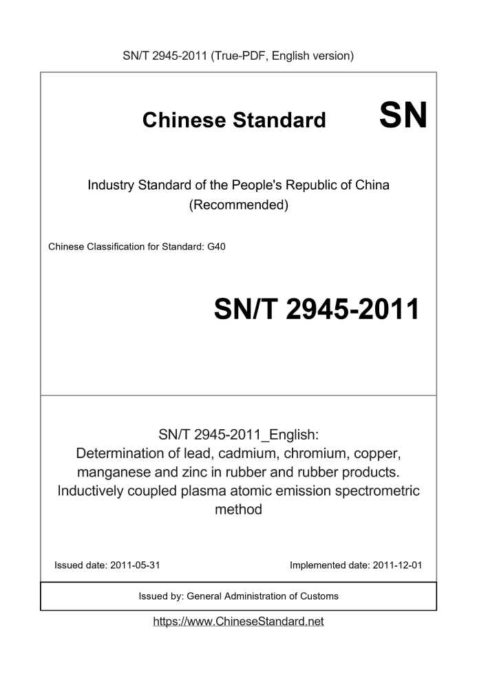 US$209.00 · In stock · Download in 9 secondsSN/T 2945-2011: Determination of lead, cadmium, chromium, copper, manganese and zinc in rubber and rubber products. Inductively coupled plasma atomic emission spectrometric method