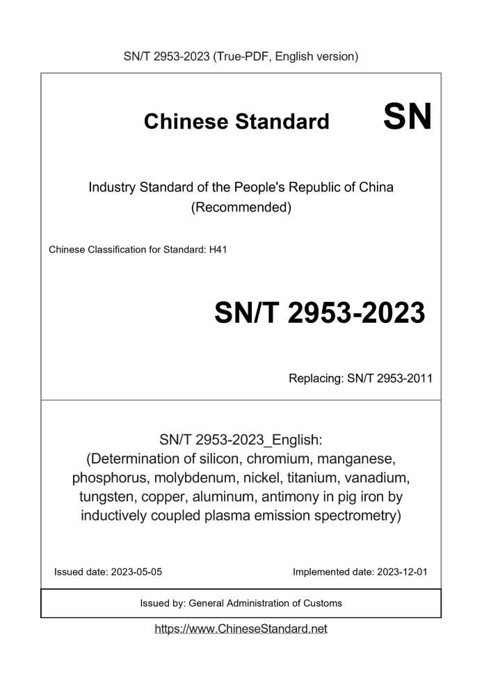 Delivery: <= 3 days. True-PDF full-copy in English will be manually translated and delivered via email. SN/T 2953-2023: (Determination of silicon, chromium, manganese, phosphorus, molybdenum, nickel, titanium, vanadium, tungsten, copper, aluminum, antimony in pig iron by inductively coupled plasma emission spectrometry) Status: Valid SN/T 2953: Historical versions