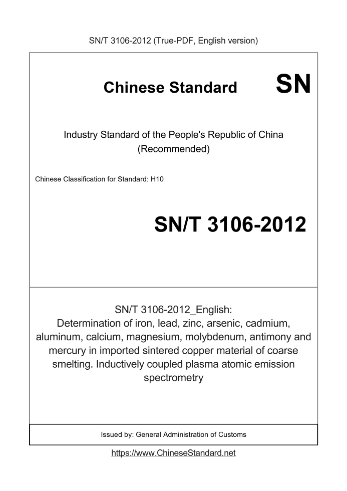 | Summary | This standard specifies the sintered materials imported copper smelting of iron, lead, zinc, arsenic, cadmium, aluminum, calcium, magnesium, molybdenum, antimony and mercury content by inductively coupled plasma atomic emission spectrometric method. This |