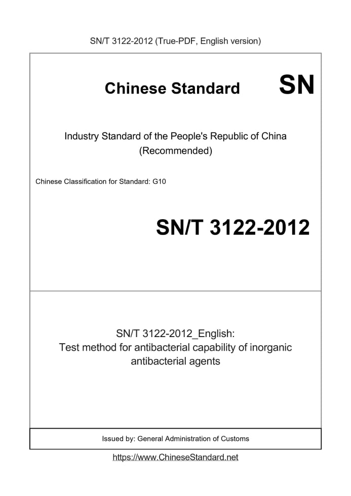 Delivery: <= 3 days. True-PDF full-copy in English will be manually translated and delivered via email. SN/T 3122-2012: Test method for antibacterial capability of inorganic antibacterial agents Status: Valid