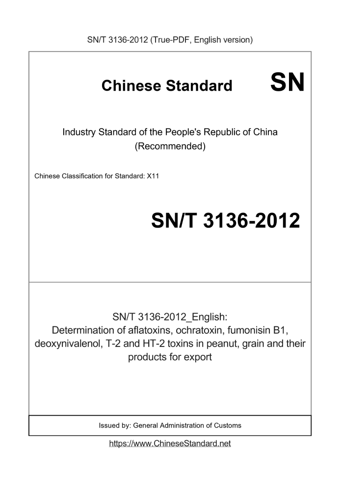 US$889.00 · In stock · Download in 9 secondsSN/T 3136-2012: Determination of aflatoxins, ochratoxin, fumonisin B1, deoxynivalenol, T-2 and HT-2 toxins in peanut, grain and their products for export