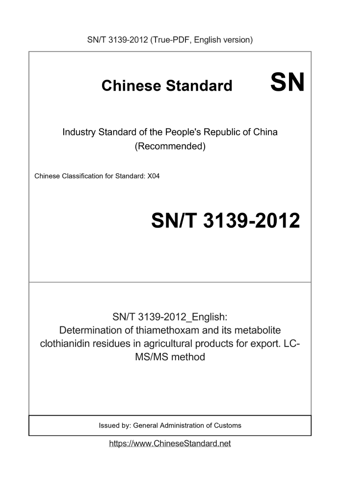 SN/T 3139-2012: Determination of thiamethoxam and its metabolite clothianidin residues in agricultural products for export. LC-MS/MS method