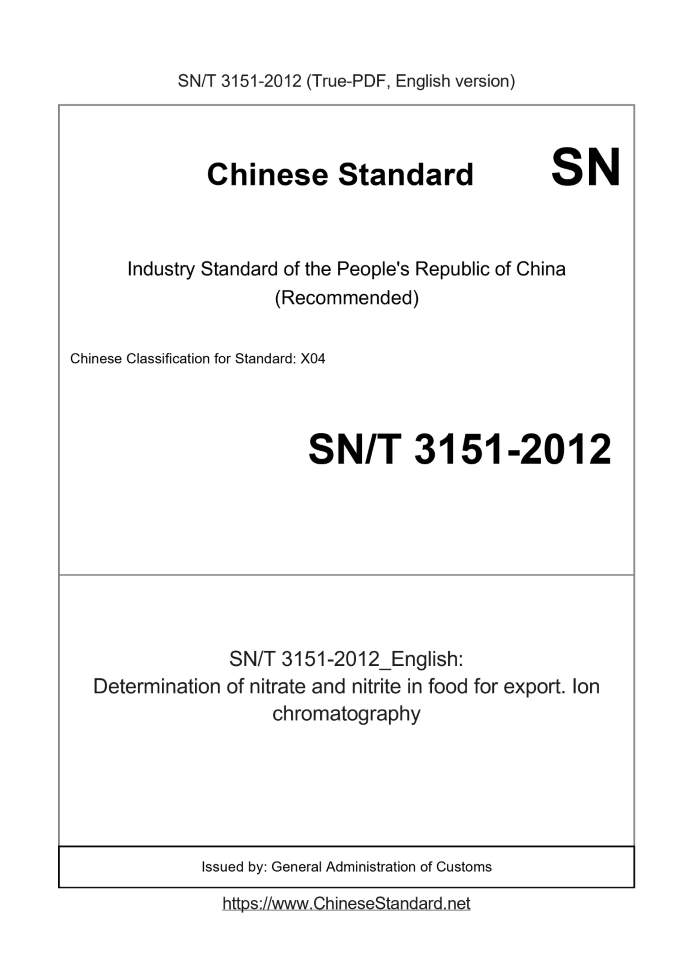 SN/T 3151-2012: Determination of nitrate and nitrite in food for export. Ion chromatography