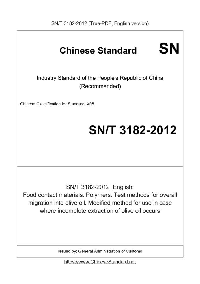 Delivery: <= 3 days. True-PDF full-copy in English will be manually translated and delivered via email. SN/T 3182-2012: Food contact materials. Polymers. Test methods for overall migration into olive oil. Modified method for use in case where incomplete extraction of olive oil occurs Status: Valid