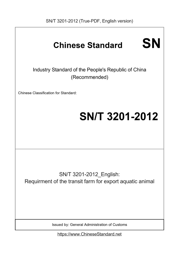 US$159.00 · In stock · Download in 9 secondsSN/T 3201-2012: Requirment of the transit farm for export aquatic animal