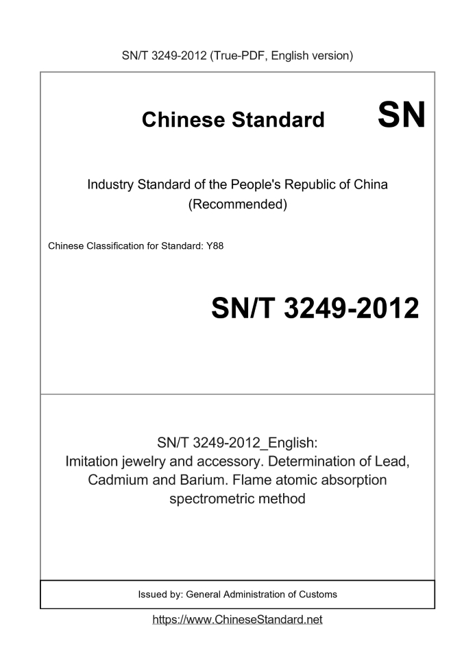 Delivery: <= 3 days. True-PDF full-copy in English will be manually translated and delivered via email. SN/T 3249-2012: Imitation jewelry and accessory. Determination of Lead, Cadmium and Barium. Flame atomic absorption spectrometric method Status: Valid