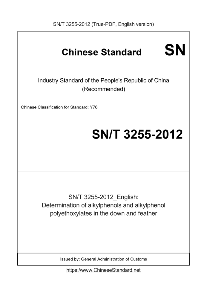 US$469.00 · In stock · Download in 9 secondsSN/T 3255-2012: Determination of alkylphenols and alkylphenol polyethoxylates in the down and feather