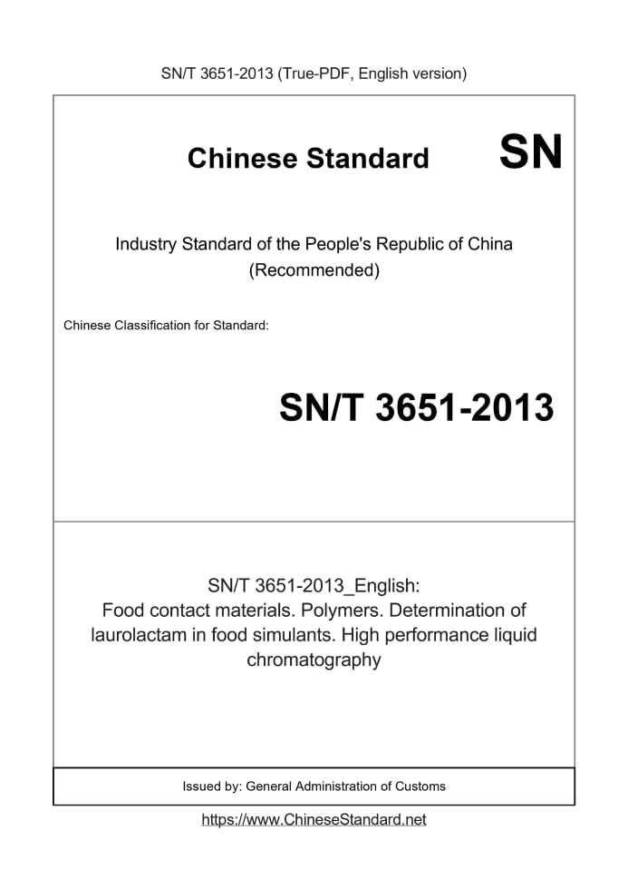 Delivery: <= 3 days. True-PDF full-copy in English will be manually translated and delivered via email. SN/T 3651-2013: Food contact materials. Polymers. Determination of laurolactam in food simulants. High performance liquid chromatography Status: Valid