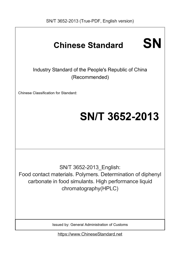 Delivery: <= 3 days. True-PDF full-copy in English will be manually translated and delivered via email. SN/T 3652-2013: Food contact materials. Polymers. Determination of diphenyl carbonate in food simulants. High performance liquid chromatography(HPLC) Status: Valid