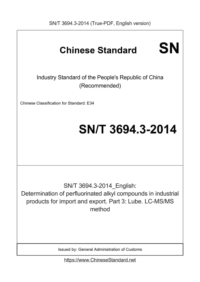 Delivery: <= 3 days. True-PDF full-copy in English will be manually translated and delivered via email. SN/T 3694.3-2014: Determination of perfluorinated alkyl compounds in industrial products for import and export. Part 3: Lube. LC-MS/MS method Status: Valid