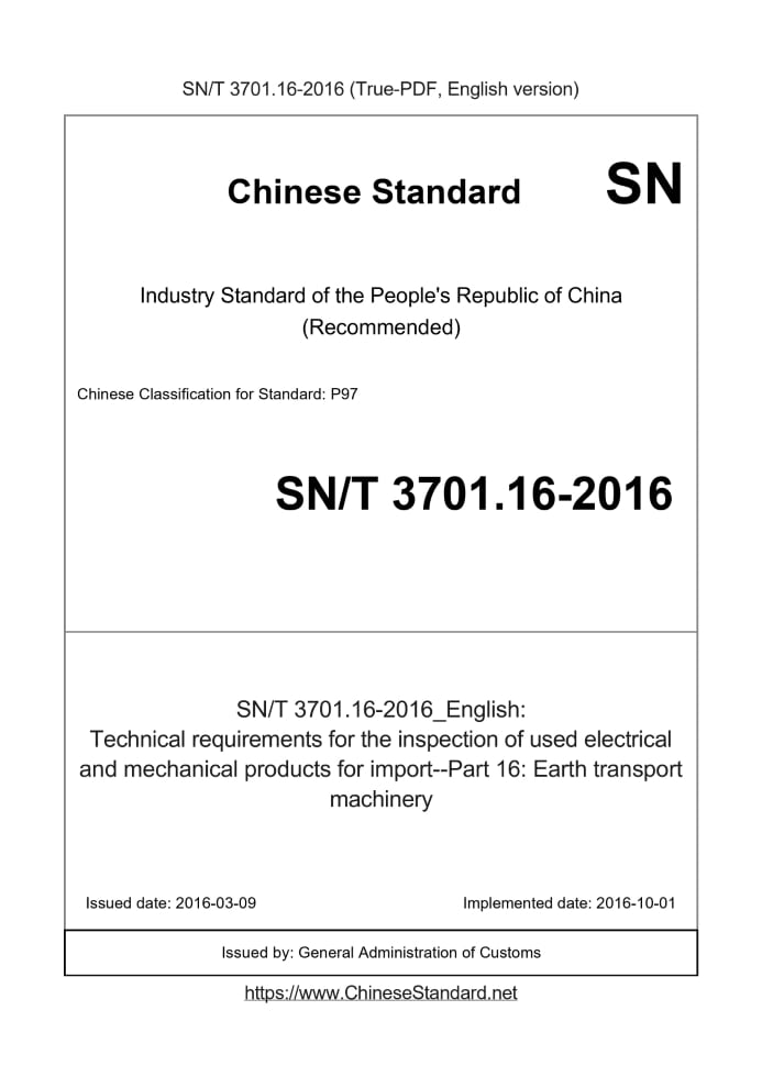 Delivery: <= 3 days. True-PDF full-copy in English will be manually translated and delivered via email. SN/T 3701.16-2016: Technical requirements for the inspection of used electrical and mechanical products for import--Part 16: Earth transport machinery Status: Valid