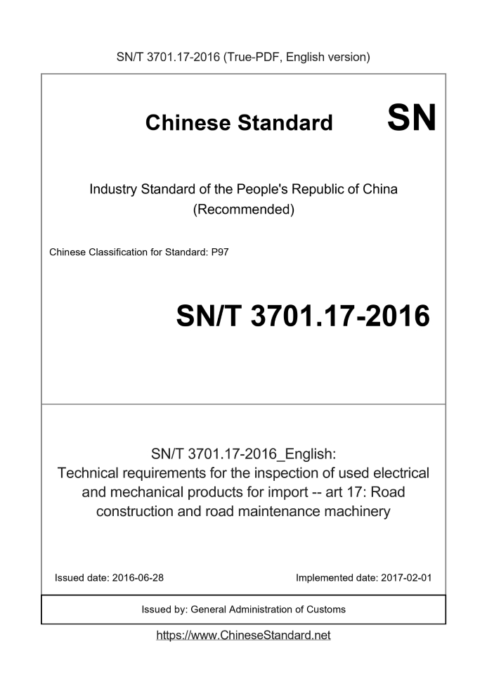 Delivery: <= 3 days. True-PDF full-copy in English will be manually translated and delivered via email. SN/T 3701.17-2016: Technical requirements for the inspection of used electrical and mechanical products for import -- art 17: Road construction and road maintenance machinery Status: Valid