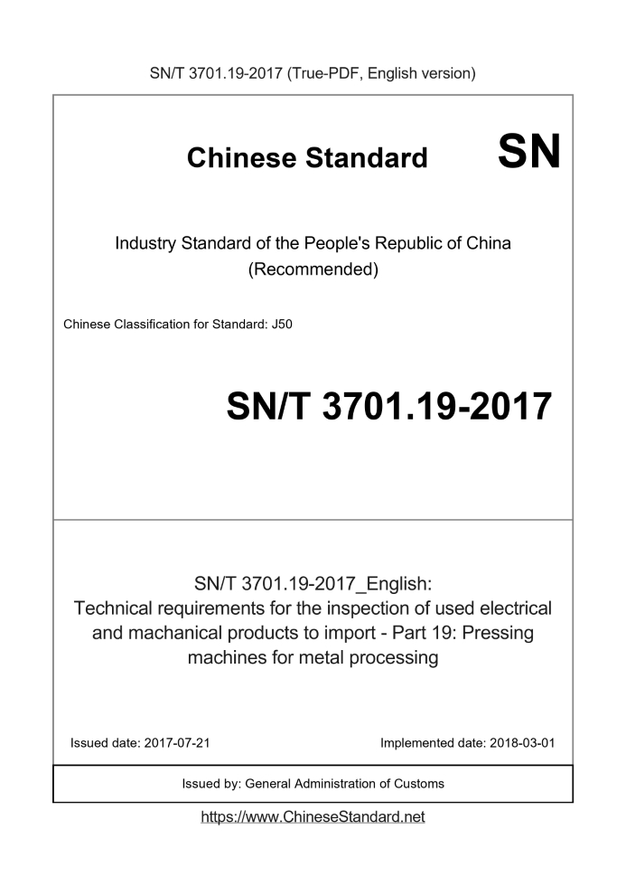 Delivery: <= 3 days. True-PDF full-copy in English will be manually translated and delivered via email. SN/T 3701.19-2017: Technical requirements for the inspection of used electrical and machanical products to import - Part 19: Pressing machines for metal processing Status: Valid