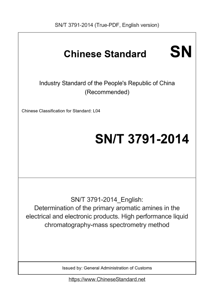 Delivery: <= 3 days. True-PDF full-copy in English will be manually translated and delivered via email. SN/T 3791-2014: Determination of the primary aromatic amines in the electrical and electronic products. High performance liquid chromatography-mass spectrometry method Status: Valid