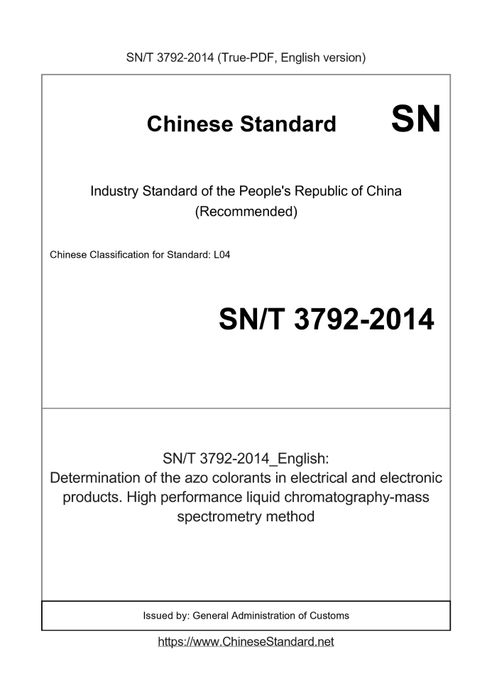 Delivery: <= 3 days. True-PDF full-copy in English will be manually translated and delivered via email. SN/T 3792-2014: Determination of the azo colorants in electrical and electronic products. High performance liquid chromatography-mass spectrometry method Status: Valid