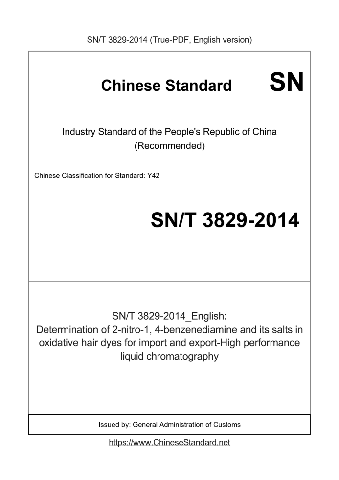 US$159.00 · In stock · Download in 9 secondsSN/T 3829-2014: Determination of 2-nitro-1, 4-benzenediamine and its salts in oxidative hair dyes for import and export-High performance liquid chromatography