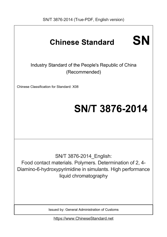 Delivery: <= 3 days. True-PDF full-copy in English will be manually translated and delivered via email. SN/T 3876-2014: Food contact materials. Polymers. Determination of 2, 4-Diamino-6-hydroxypyrimidine in simulants. High performance liquid chromatography Status: Valid