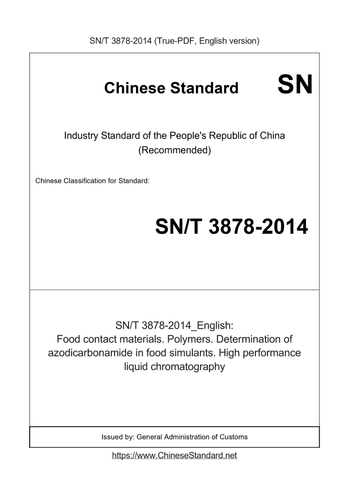Delivery: <= 3 days. True-PDF full-copy in English will be manually translated and delivered via email. SN/T 3878-2014: Food contact materials. Polymers. Determination of azodicarbonamide in food simulants. High performance liquid chromatography Status: Valid