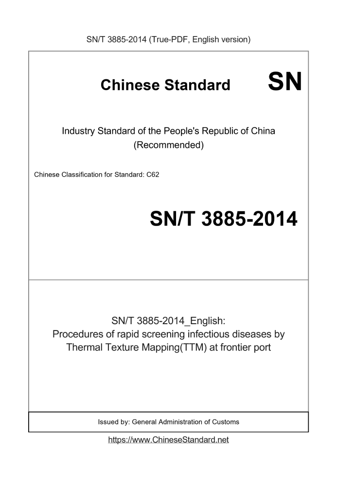 Delivery: <= 3 days. True-PDF full-copy in English will be manually translated and delivered via email. SN/T 3885-2014: Procedures of rapid screening infectious diseases by Thermal Texture Mapping(TTM) at frontier port Status: Valid