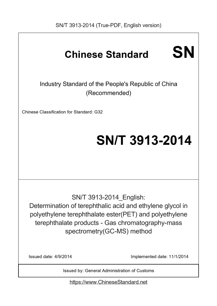 Delivery: <= 3 days. True-PDF full-copy in English will be manually translated and delivered via email. SN/T 3913-2014: Determination of terephthalic acid and ethylene glycol in polyethylene terephthalate ester(PET) and polyethylene terephthalate products - Gas chromatography-mass spectrometry(GC-MS) method Status: Valid
