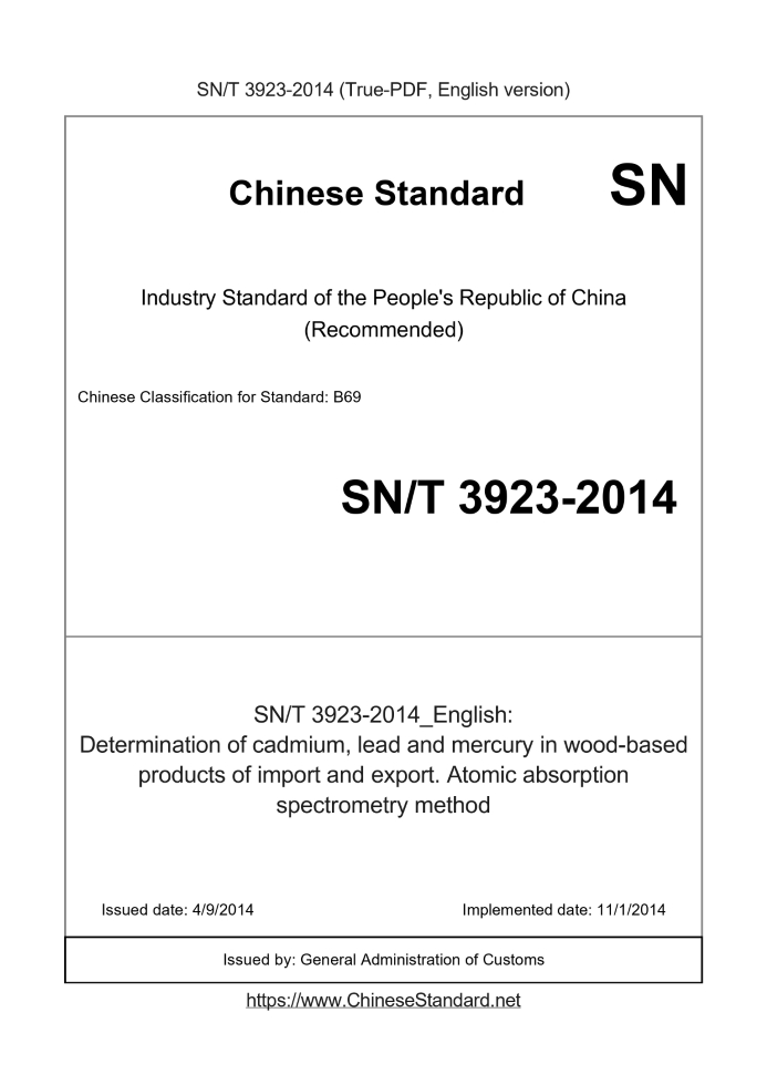 Delivery: <= 3 days. True-PDF full-copy in English will be manually translated and delivered via email. SN/T 3923-2014: Determination of cadmium, lead and mercury in wood-based products of import and export. Atomic absorption spectrometry method Status: Valid