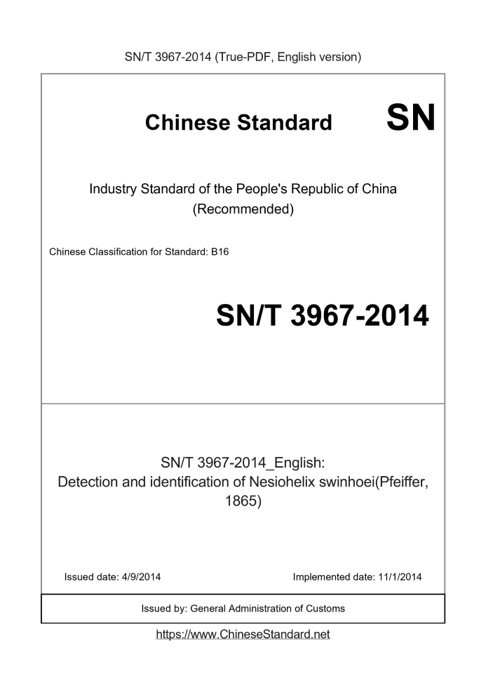 Delivery: <= 3 days. True-PDF full-copy in English will be manually translated and delivered via email. SN/T 3967-2014: Detection and identification of Nesiohelix swinhoei(Pfeiffer, 1865) Status: Valid