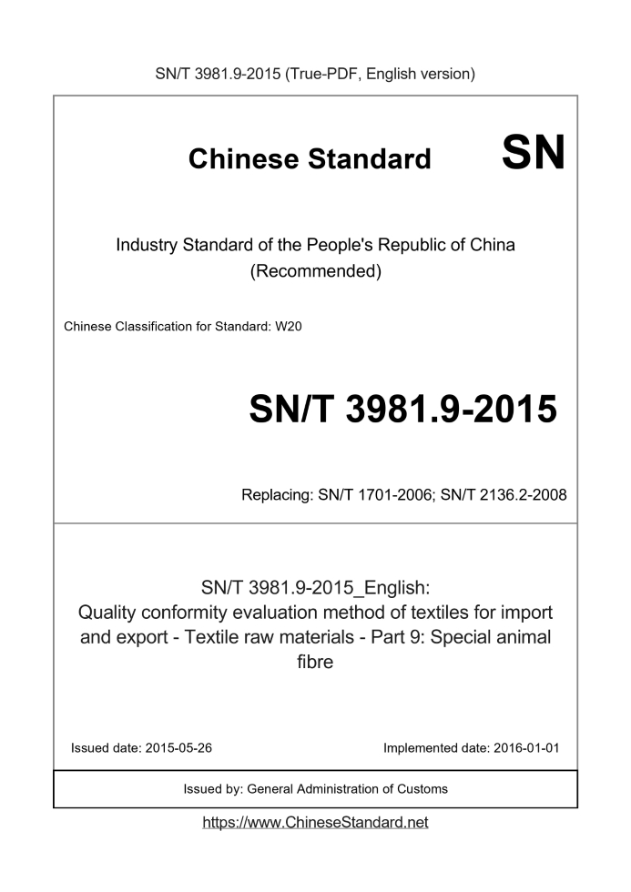 Delivery: <= 3 days. True-PDF full-copy in English will be manually translated and delivered via email. SN/T 3981.9-2015: Quality conformity evaluation method of textiles for import and export - Textile raw materials - Part 9: Special animal fibre Status: Valid