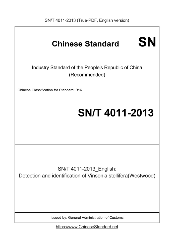 Delivery: <= 3 days. True-PDF full-copy in English will be manually translated and delivered via email. SN/T 4011-2013: Detection and identification of Vinsonia stellifera(Westwood) Status: Valid