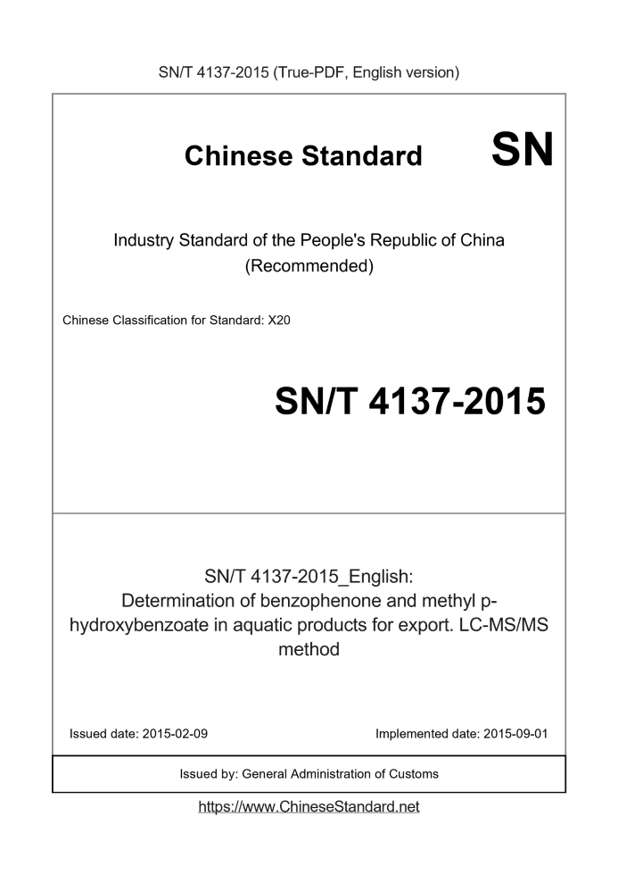 Delivery: <= 3 days. True-PDF full-copy in English will be manually translated and delivered via email. SN/T 4137-2015: Determination of benzophenone and methyl p-hydroxybenzoate in aquatic products for export. LC-MS/MS method Status: Valid