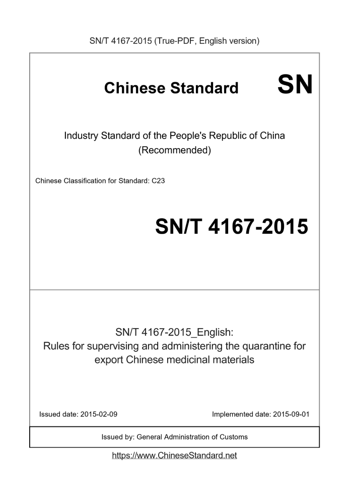Delivery: <= 3 days. True-PDF full-copy in English will be manually translated and delivered via email. SN/T 4167-2015: Rules for supervising and administering the quarantine for export Chinese medicinal materials Status: Valid