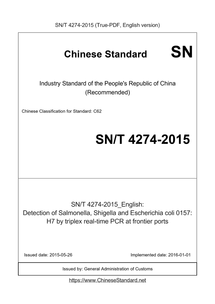 Delivery: <= 3 days. True-PDF full-copy in English will be manually translated and delivered via email. SN/T 4274-2015: Detection of Salmonella, Shigella and Escherichia coli 0157: H7 by triplex real-time PCR at frontier ports Status: Valid