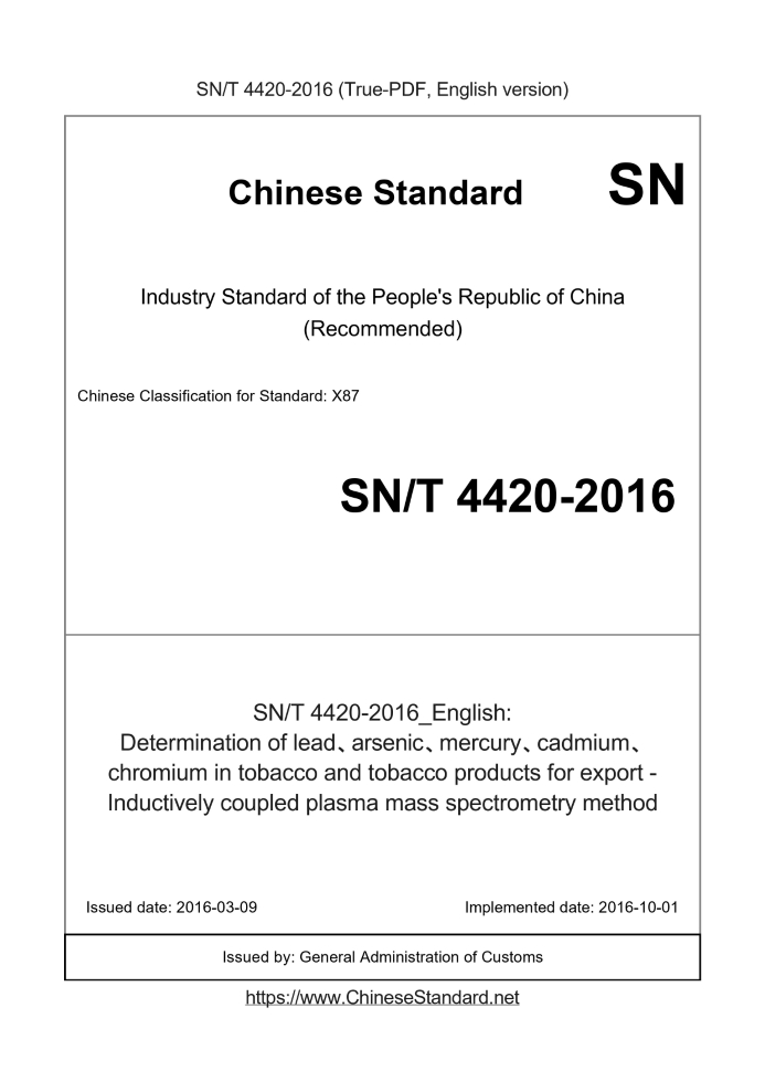 Delivery: <= 3 days. True-PDF full-copy in English will be manually translated and delivered via email. SN/T 4420-2016: Determination of lead、arsenic、mercury、cadmium、chromium in tobacco and tobacco products for export - Inductively coupled plasma mass spectrometry method Status: Valid